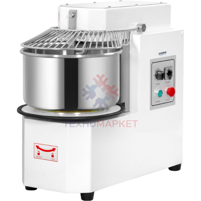Оборудован подъёмной траверсой и съёмной дежой. Корпус выполнен из окрашенного металла, все детали, соприкасающиеся с продуктами (дежа, крюк, защитная решётка) – из нержавеющей стали. Рекомендуется к применению в кафе, ресторанах, пекарнях и на других предприятиях общественного питания среднего формата.