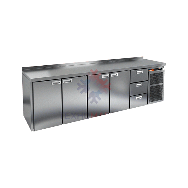Оснащён легкозаменяемыми магнитными уплотнителями. Имеет ящики и распашные двери с автоматическими доводчиками и фиксатором открытого положения. Регулируемые по высоте ножки гарантируют устойчивость на неровной поверхности и позволяют подстраивать высоту оборудования под текущие потребности. Изготовлен из нержавеющей стали.
