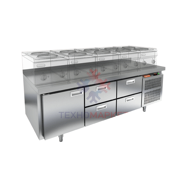 Оснащён легкозаменяемыми магнитными уплотнителями. Имеет ящики и распашную дверь с автоматическими доводчиками и фиксатором открытого положения. Регулируемые по высоте ножки гарантируют устойчивость на неровной поверхности и позволяют подстраивать высоту оборудования под текущие потребности. Изготовлен из нержавеющей стали.