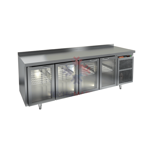 Оснащён легкозаменяемыми магнитными уплотнителями. Имеет стеклянные распашные двери с автоматическими доводчиками и фиксатором открытого положения. Регулируемые по высоте ножки гарантируют устойчивость на неровной поверхности и позволяют подстраивать высоту оборудования под текущие потребности. Есть подсветка, работающая постоянно при подключении стола к сети, в том числе при закрытых дверях.