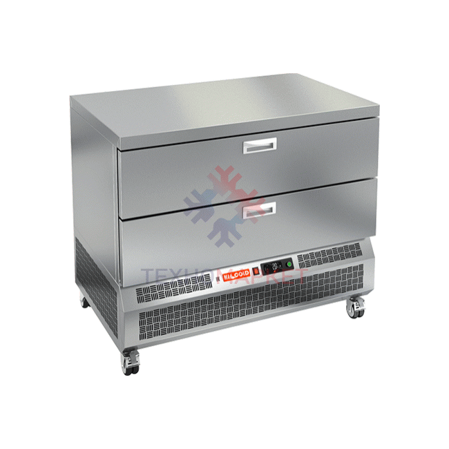 Оснащена функцией автоматической оттайки. Имеет легкозаменяемые магнитные уплотнители и два выдвижных ящика под 6 гастроёмкостей GN 1/1. Колёса со стопором обеспечивают свободное перемещение оборудования внутри помещения. Изготовлена из нержавеющей стали.