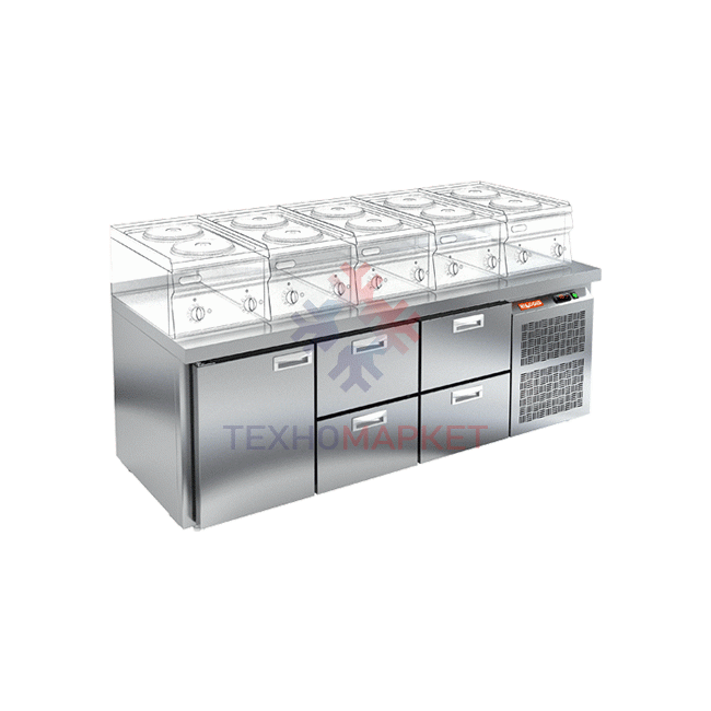 Оснащён легкозаменяемыми магнитными уплотнителями. Имеет распашные двери с автоматическими доводчиками и фиксатором открытого положения. Регулируемые по высоте ножки гарантируют устойчивость на неровной поверхности и позволяют подстраивать высоту оборудования под текущие потребности. Изготовлен из нержавеющей стали.