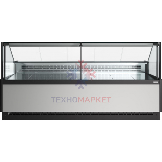 Экспозиционная поверхность и столешница изготовлены из шлифованной нержавеющей стали, декоративная фронтальная панель – из металла.