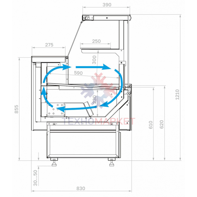 - Двухступенчатые поддоны для выкладки товара (высота 120 мм, глубина 480 мм)