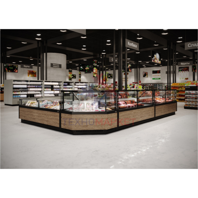 Экспозиционная поверхность и столешница изготовлены из шлифованной нержавеющей стали, декоративная фронтальная панель – из металла.