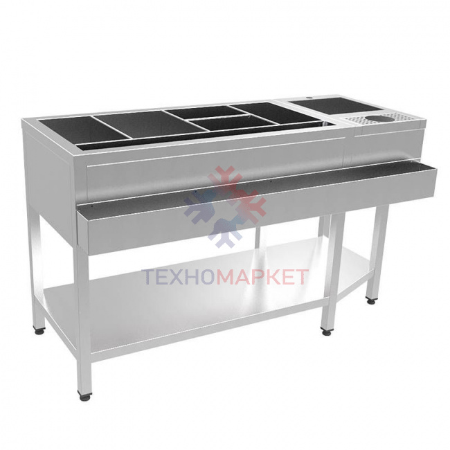 Барная cтанция Кобор СБ-150/68 – многофункциональный нейтральный модуль для ресторанов, баров, кофеен. Предназначен для мойки, сушки посуды и приборов, установки бутылок и вспомогательного оборудования. Позволяет минимизировать площадь рабочего пространства для комфортной работы персонала.