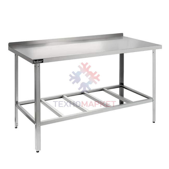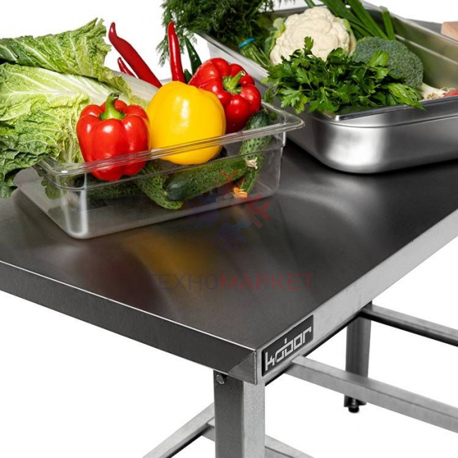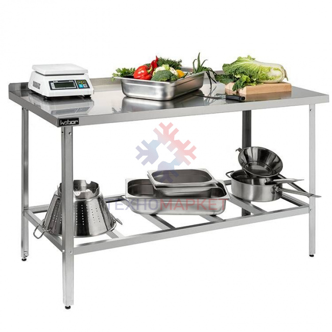 - Стол оснащён столешницей с отогнутым вверх задним бортом и предназначен для установки около стены. Борт предохраняет от попадания продуктов питания на стену или пол;