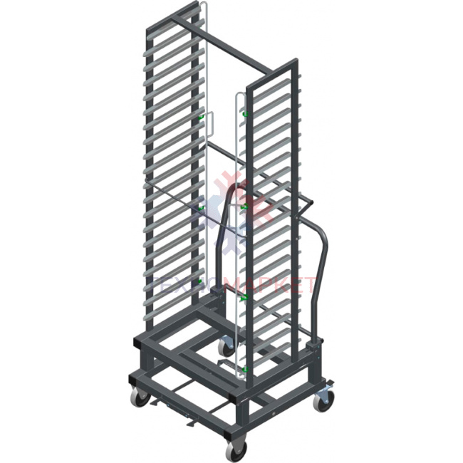 Тележка Abat ТДШ-40-11 предназначена для перемещения противней и гастроёмкостей по кухне, а также размещения их внутри шкафа шоковой заморозки ШОК-40-01. Каркас с гастроёмкостями остаётся в рабочей камере, а основание с ручкой при помощи педали удаляются для возможности закрытия двери.