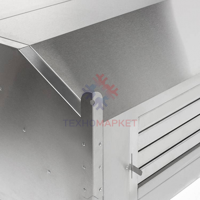 - Зонт имеет приточные вентиляционные решетки, в которых расположены жалюзи. Положение жалюзи, меняется с помощью рычажков. Изменяя положение жалюзи, меняется направление приточного воздуха – поток можно направлять вниз или прямо. Наличие приточной вентиляции создает нормальный микроклимат в горячих цехах на рабочих местах;