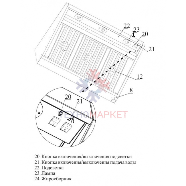 Принцип работы: попадая в такой зонт, воздушные массы сначала фильтруются от жира и сажи. После воздух направляется в сформированную водяную завесу, которая охлаждает его и удаляет остатки продуктов горения. Использованная жидкость и отфильтрованные примеси удаляются в канализационный сток, в то время как очищенный воздух поступает в вентиляционную систему.