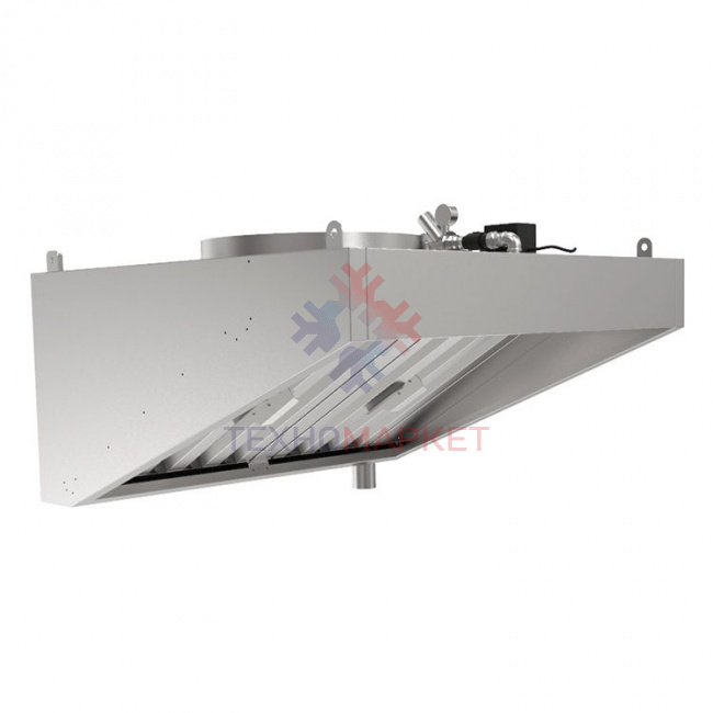Принцип работы: попадая в такой зонт, воздушные массы сначала фильтруются от жира и сажи. После воздух направляется в сформированную водяную завесу, которая охлаждает его и удаляет остатки продуктов горения. Использованная жидкость и отфильтрованные примеси удаляются в канализационный сток, в то время как очищенный воздух поступает в вентиляционную систему.