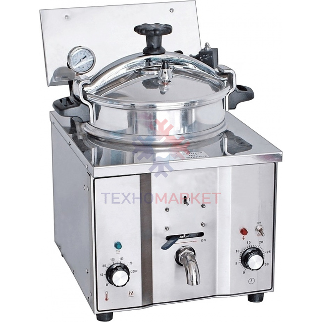 Благодаря высокому давлению во фритюрнице в продукте сохраняются собственные соки и уменьшается проникновение масла внутрь. Блюда получаются нежными и имеют насыщенный вкус. Кран для слива масла помогает быстро очистить ёмкость. Корпус изготовлен из нержавеющей стали.