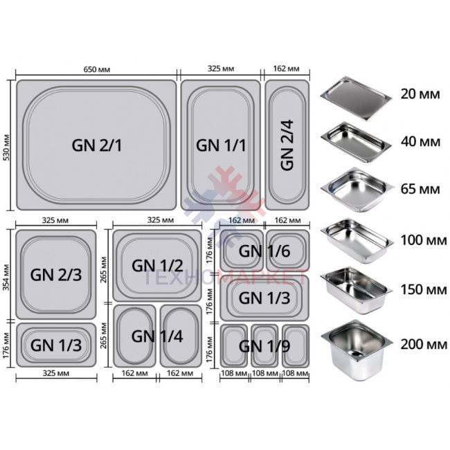 - 6 x GN 1/3 (325x176x40(65) мм) и 1 x GN 1/1 (325х530х40(65) мм)